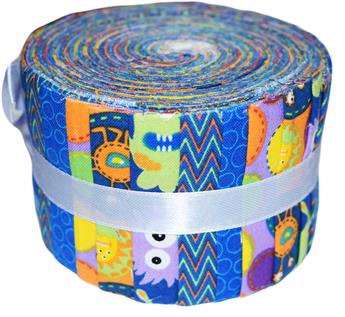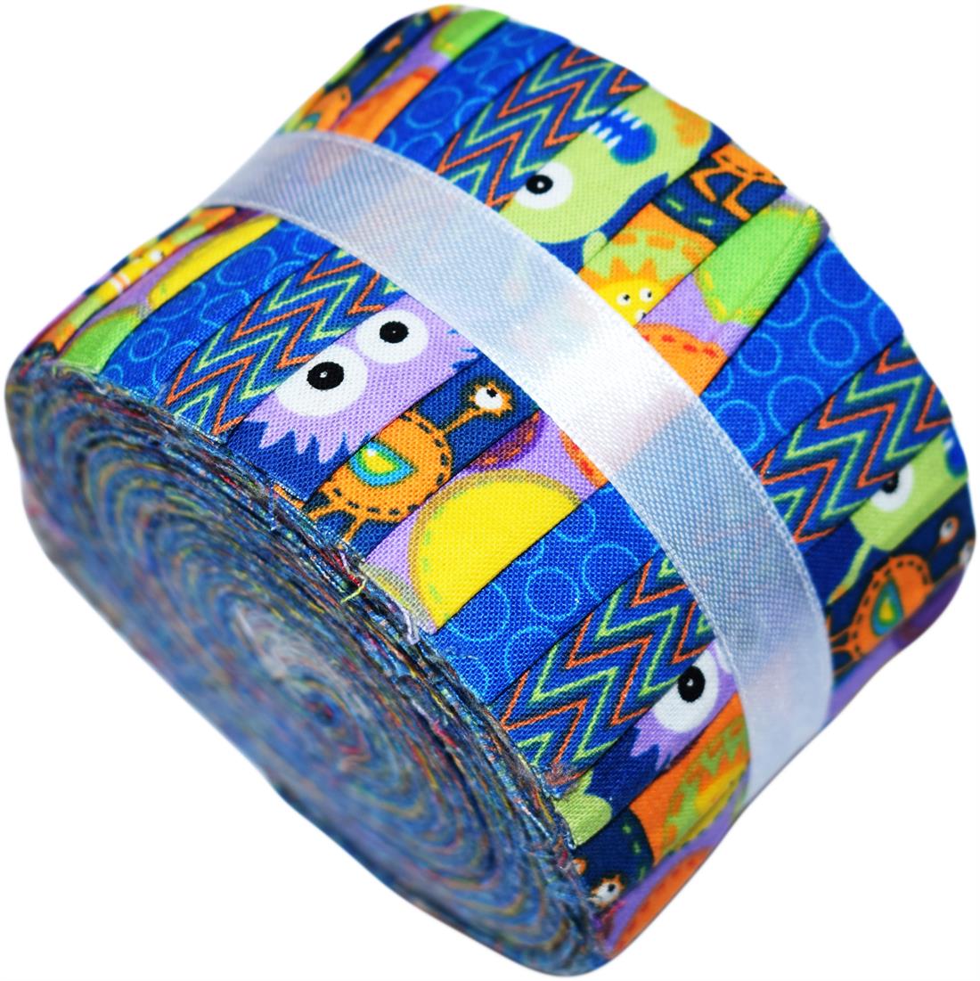 Mini Jelly Rolls. Bombay Stores Fabrics are happy to bring you 'Monster Mayhem' Mini Jelly Rolls. The fabric pack consists of 20 strips of mixed 'Monster Mayem' Crafting cotton quality fabrics. Size per strip is 2.5"x45".Total fabric in the pack is Approximately 1.25 meters