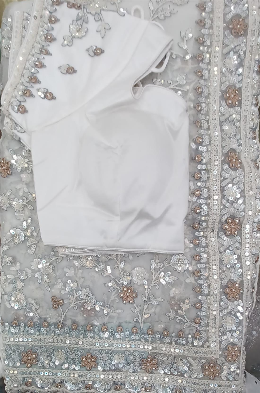 Net saree with sequince and pearl embroidary havy work.It comes with readymade short sleeve blouse and maching petticoat.