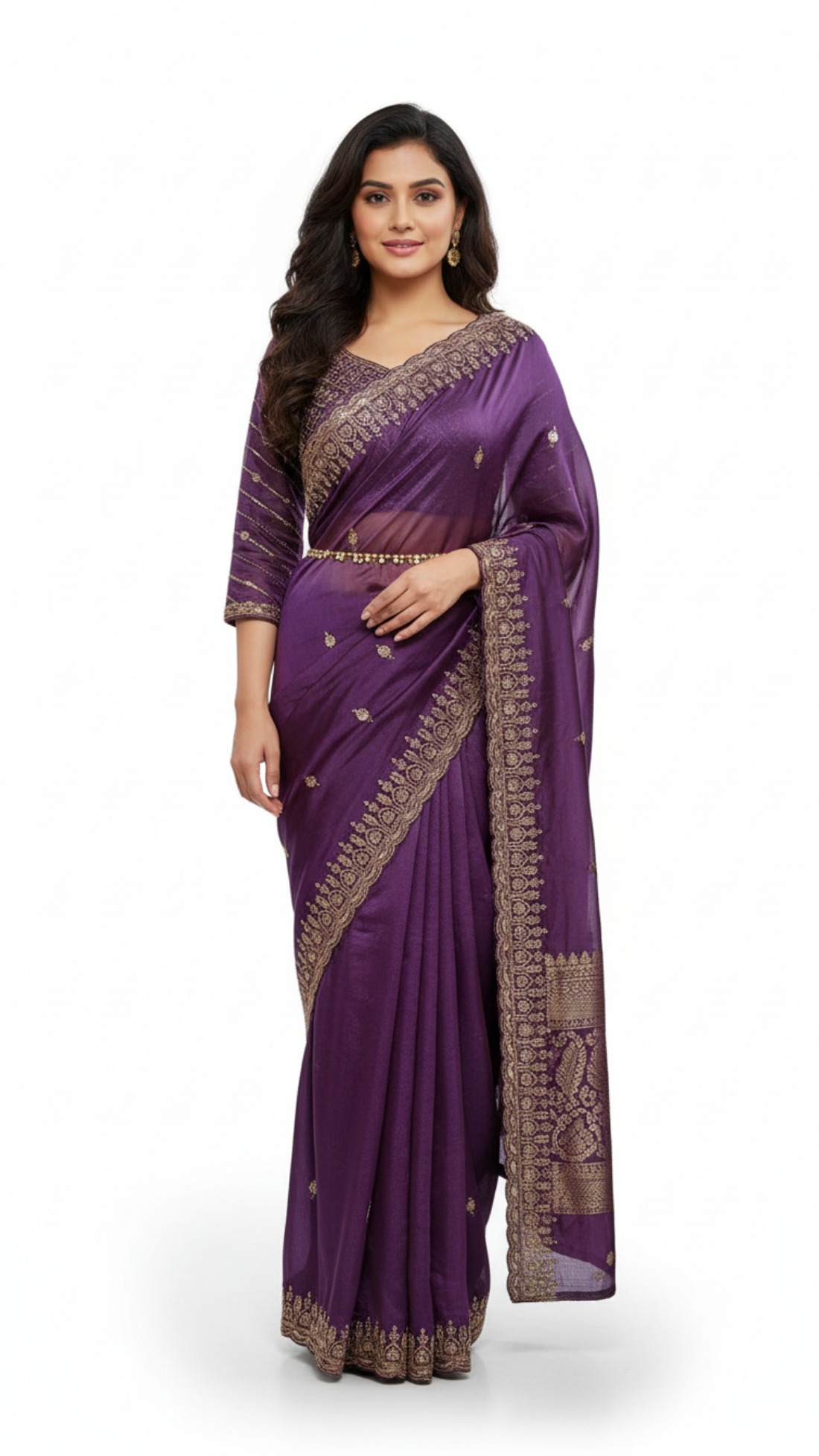 Shimmer silk saree with kasab,siquince and motti work.Its comes with readymade hevey embroidery blouse with long sleeves. Size10-12.