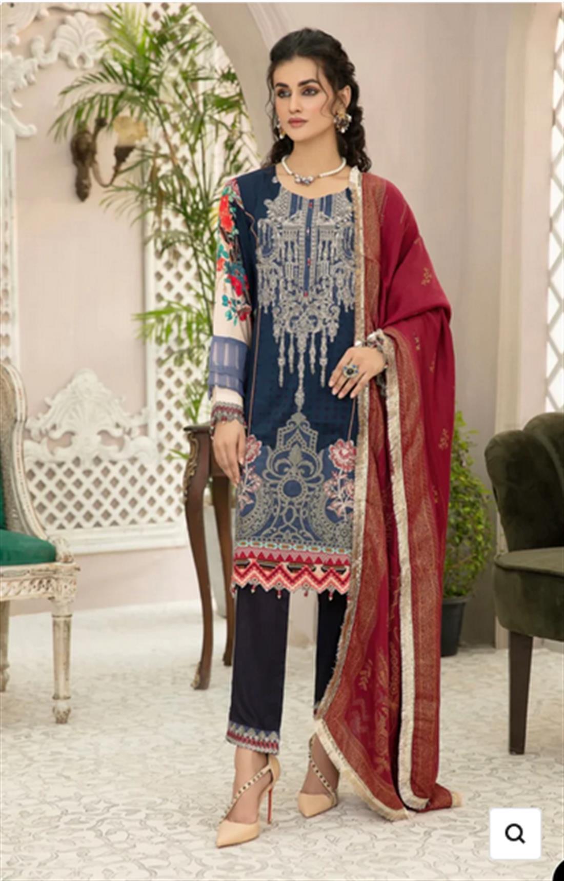 | FABRIC Design | Blue Embroidered Linen suit with Wool Shawl |